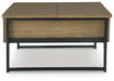 Give your space a sleek, urban edge with this lift-top coffee table. A light brown wood-tone finish and a contrasting gunmetal gray frame create a modern mixed-material look that pairs effortlessly with today's sofas and sectionals. The spring-lift top glides up to create a convenient workspace or dining surface, while dual smooth-gliding drawers keep remotes, tech and clutter neatly out of sight. This table is polished, put together and needs a good home.
